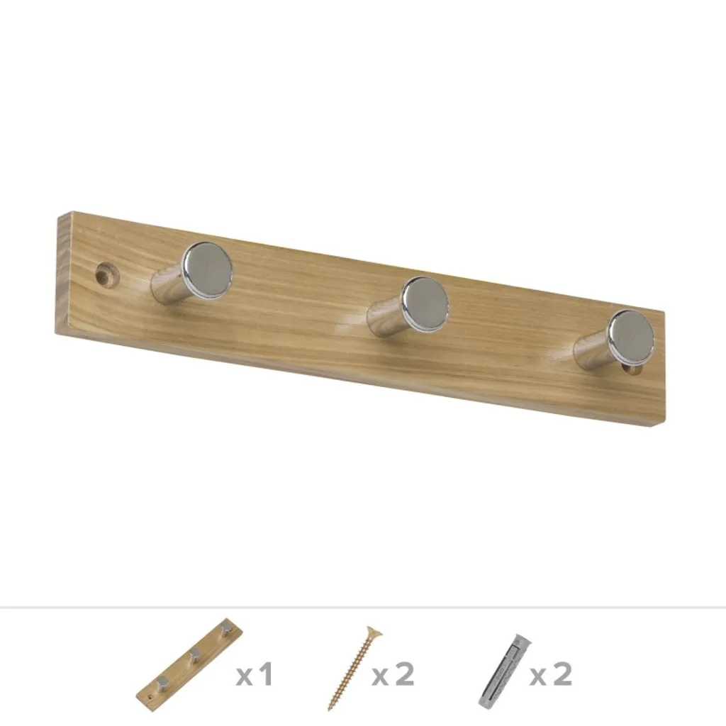 Die Velano Garderobenleiste ist eine stilvolle Lösung zur Wandmontage, um Jacken, Taschen, Handtücher oder Kleidung ordentlich und griffbereit aufzuhängen. Das helle Holz in Kombination mit dezenten Chromhaken fügt sich harmonisch in nahezu jedes Raumkonzept ein – von modern bis klassisch.
